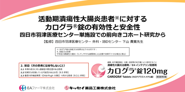 | 目的 | 寛解導入目的にカログラ®錠を投与された中等症の活動期潰瘍性大腸炎(UC)患者を対象に、実臨床下でのカログラ®錠の有効性と安全性を検討する。 |
