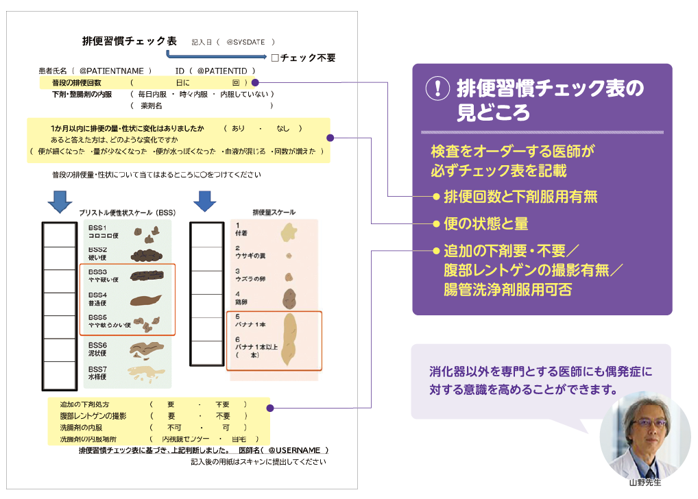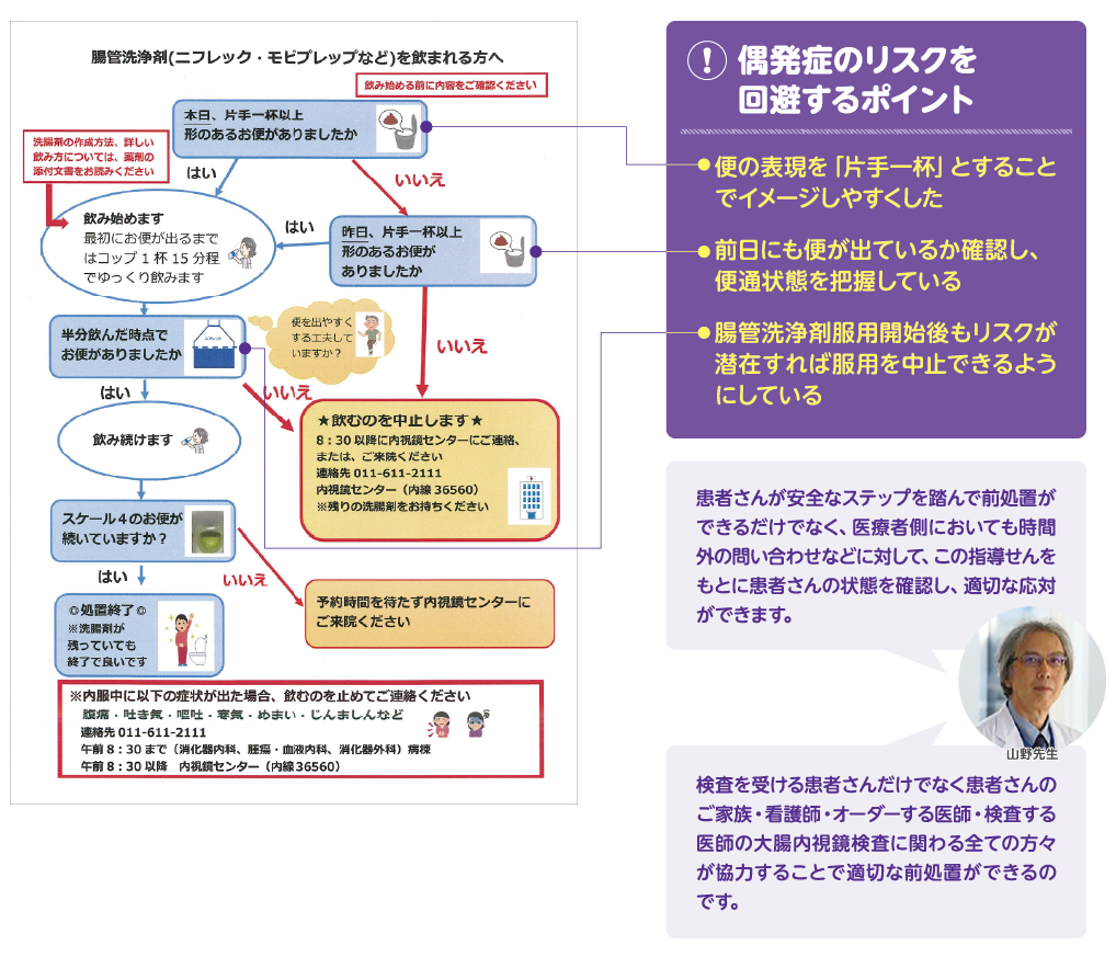 その数年前から前処置のフローチャートづくりに取り組んでいましたが、完成には至っていませんでした。偶発症を経験したことで、在宅前処置の患者さんが「適切に腸管洗浄剤を内服できる!」「リスク回避行動がとれる!」という視点に絞り、状況に沿った行動を指示するフローチャートを作成しました。また、検査前の偶発症リスク評価も重要と考え、排便習慣チェック表を医師とともに作成し、検査オーダー時に医師が確認するようにしました。