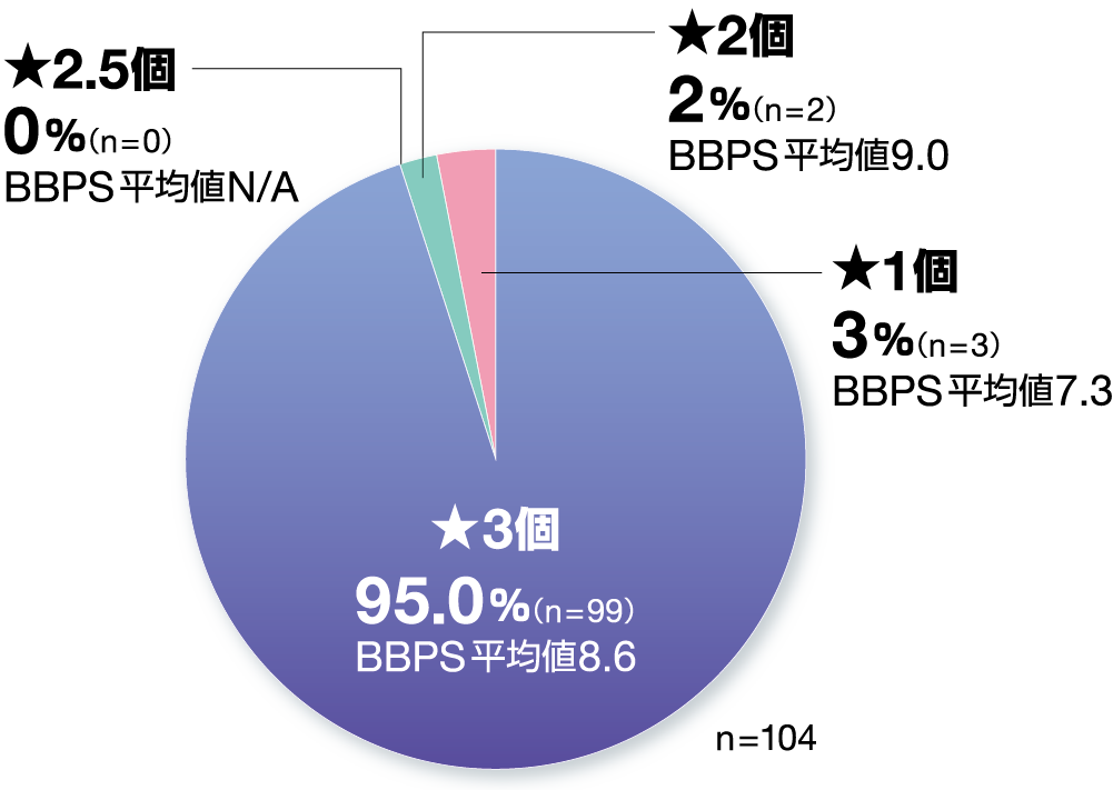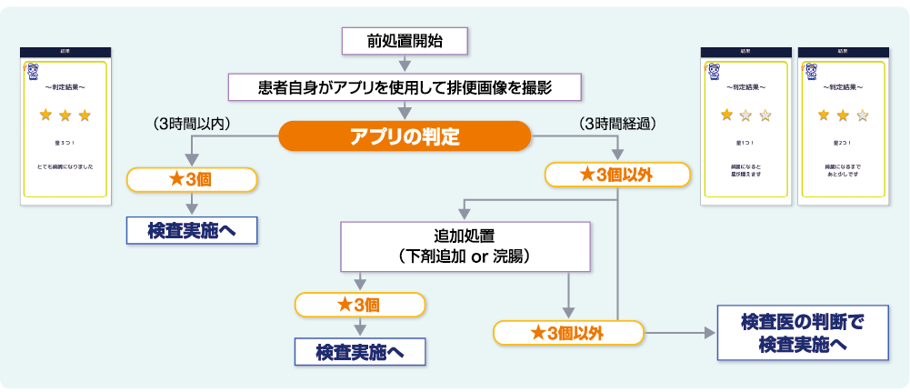 appがダウンロードされたデバイスを患者に貸与し、大腸内視鏡検査当日の腸管洗浄液を内服した後の初回の排便時から排便画像を撮像するように指示した。排便画像の撮像の際には、使用済みのトイレットペーパーで排便が隠れて評価できなくなることを避けるために、トイレットペーパーを汚物入れに入れた後で排便画像を撮影するよう指示した。 前処置開始から3時間が経過した時点で、appの判定が★3個であれば大腸内視鏡検査を実施した。前処置開始から3時間が経過した時点でappの判定が★3個でない場合は医師の判断により追加処置(腸管洗浄液の追加内服または浣腸)を行い、appの判定が★3個になった場合には大腸内視鏡検査を実施した。これらの処置を許容できない患者や、追加処置を実施してもアプリの判定が★3個にならない患者に対しては医師の判断で大腸内視鏡検査を実施した。(図B) 図B. 検査前処置の流れ. ![]() |