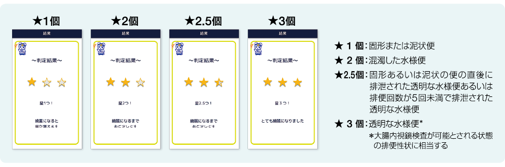 appでは排便性状は、図Aのように4段階で評価され★1個、★2個、★2.5個、★3個で表示される。固形あるいは泥状の便は★1個、濁りのある水様便は★2個、固形あるいは泥状の便の直後に排泄された透明な水様便、あるいは排便回数が5回未満で排泄された透明な水様便は★2.5個、透明な水様便は★3個で表示される。 図A. ![]() |