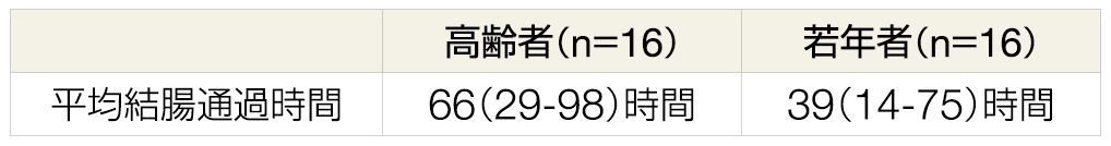 | 方法 | 朝に、ラベルマーカーを含む1600kJのリキッドおよび固形食(80gのパン、120gのオムレツ、200gの水)を10分で摂取後、ラベルマーカーが小腸から検出されなくなるまで、30分間隔でガンマカメラにて確認した。翌日からは、24時間毎にラベルマーカーが結腸から排出するまでガンマカメラで確認し、結腸通過時間を測定した。なお、水に111In-DTPAを加え、99mTcはオムレツに加え、ラベルマーカーとした。 |