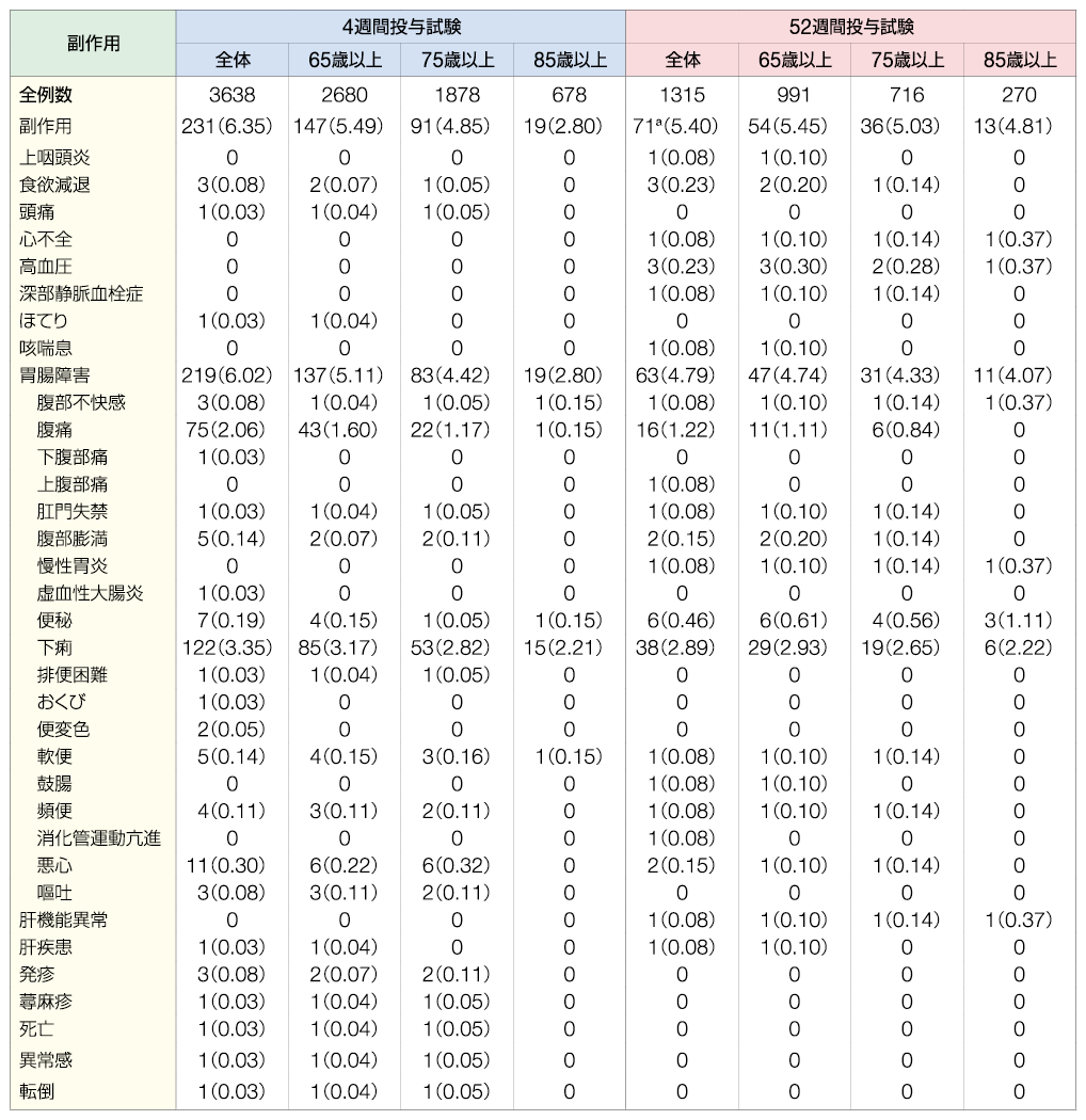 また、前治療薬として塩類下剤、刺激性下剤を使用していたがグーフィス®に切り替えた患者(Switch群)、またはそれらにグーフィス®を追加した患者(Add-on群)についてのサブグループ解析を行ったところ、副作用発現率は、4週間投与試験でSwitch群7.67%、Add-on群6.45%、52週間投与試験ではSwitch群5.60%、Add-on群6.25%、有効性については4週間投与試験、52週間投与試験において、Switch群、Add-on群ともにグーフィス®投与後に週当たりの排便回数が増加するなど、良好な結果が得られた。