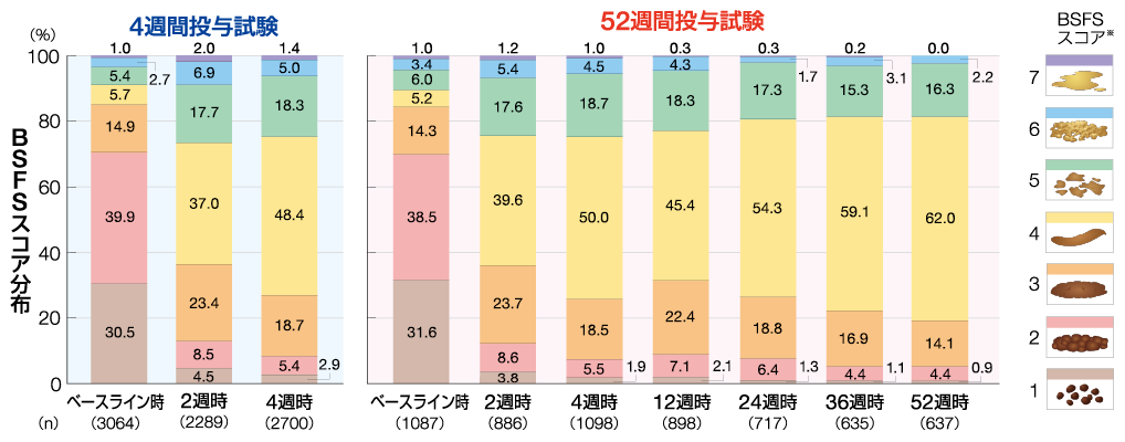 *1)FAS:Full Analysis Set(最大の解析対象集団)治験薬が1回以上投与され、何らかの有効性に関する観測値を持つすべての被験者による集団を「最大の解析対象集団」とした。なお、排便回数の各週の評価可能日が5日未満の場合には、該当週の排便回数は欠測値として扱った。